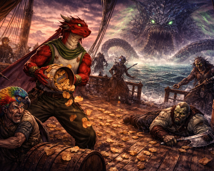 When a whirlpool summons undead pirates and something vast beneath the waves, survival becomes the only goal. Gloom shields Runtar, a parrot terrorises Bawbaggins, and even a barrel of Chrisgles fails to soothe the deep. Sometimes victory means simply getting away.
