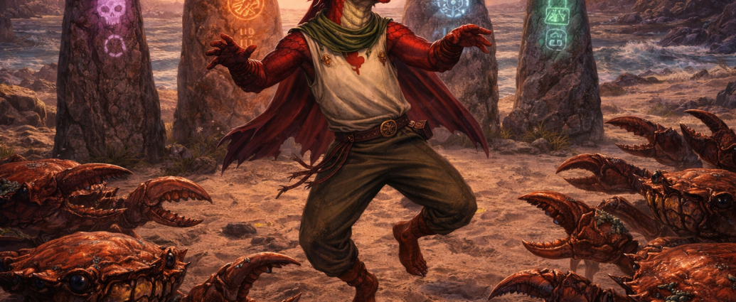 Following a map Bawbaggins recovered from the pirate ship, the party reaches a quiet beach marked by ancient standing stones and a carved riddle. Giant crabs interrupt the investigation, and somewhere in the chaos Runtar finds himself compelled to dance… before everything goes dark. When he wakes, the crabs are dead, the riddle is solved, and the stones have revealed a second map.Find Out More